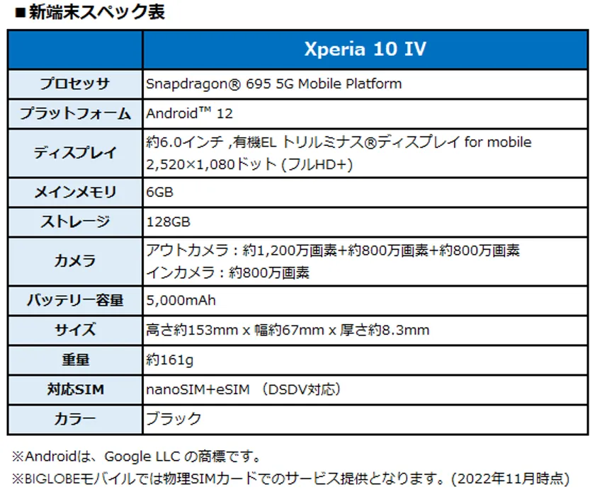 ビッグローブ株式会社(本社:東京都品川区、代表取締役社長:有泉 健、以下 BIGLOBE)は、モバイルサービス「BIGLOBEモバイル」において、ソニー製スマートフォン、「Xperia 10 IV」の提供を11月1日より開始します(注1)。