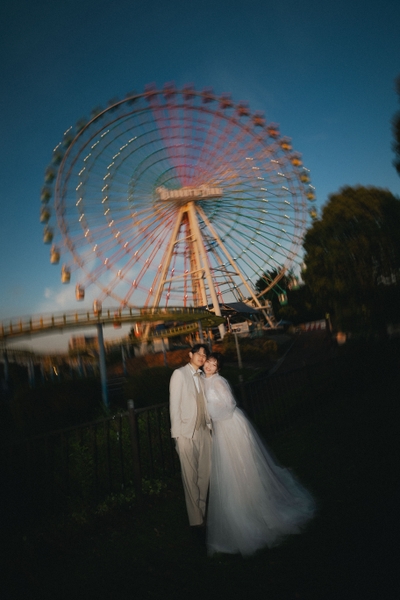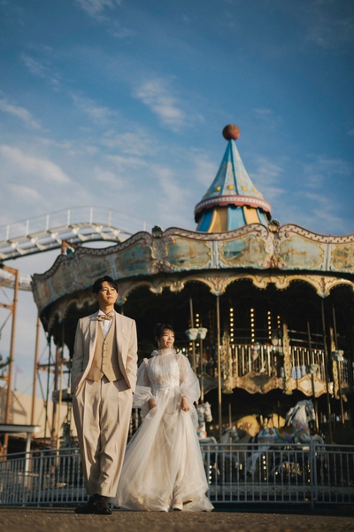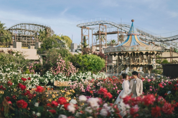 秋は結婚式が一年で最も多いと言われる季節。ひらかたパーク(大阪府枚方市枚方公園1-1)では、 園内各所をロケーションとした「ウェディングフォトロケーションサービス」をフォトスタジオと共同で年間を通して実施しています。今年で3年目を迎える本サービスは毎年人気が高まっており、 昨年は前年の2倍以上のお客さまにご利用いただきました。一番人気のイルミネーションを背景にした撮影をはじめ、秋に咲き誇る「ローズガーデン(バラ園)」内での撮影や、メリーゴーラウンド等アトラクションとの撮影がおすすめです。