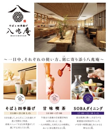 同年10月27日(木)に、石臼挽き国産そば粉を使用した二八そばや、旬の季節素材を使用したかき揚げ、限定スイーツと銘酒が楽しめる「そばと四季揚げ 八兆庵」を野々市本町にオープンします。昼・午後・夜それぞれの時間に『自分軸』で利用しやすい、身体と気持ちに優しい食と空間を一日を通して提供します。