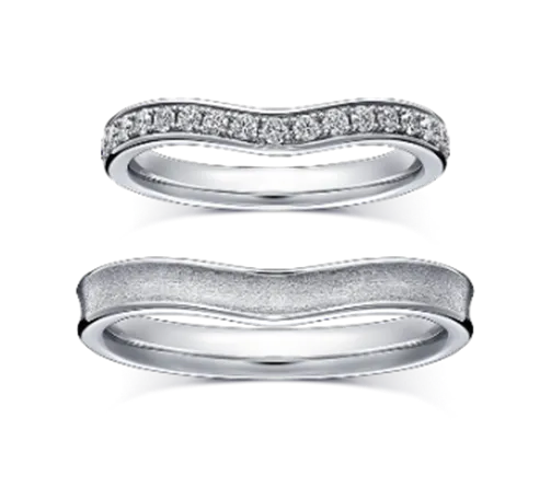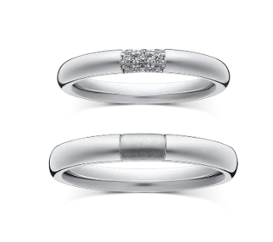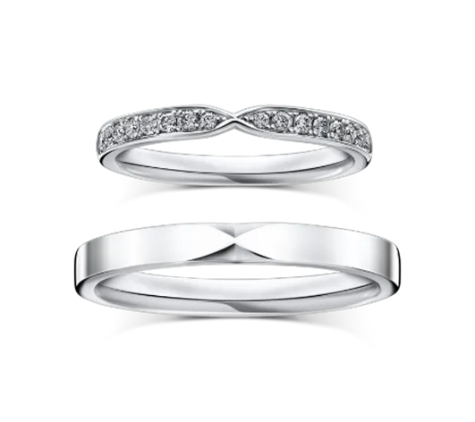 輝き躍動する街で出会い、絆を結ぶ「ふたり」をイメージ。普遍性のあるデザインながら中央のカットが生みだす“ひと味違う表情”が光るリング。メレダイヤモンドが敷き詰められたもう片方のリングはエンゲージリングを受け止めるフォルムで、重ね着けにも最適です。
