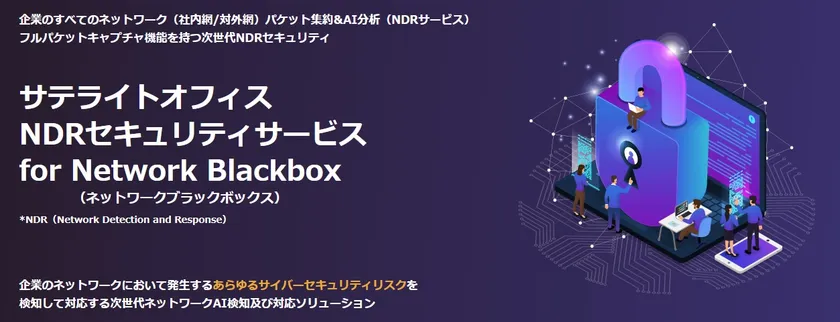 クラウド環境、サテライト環境でのビジネス支援に特化したインターネットシステムソリューションベンダーである株式会社サテライトオフィス(本社:東京都江東区、代表取締役社長:原口 豊、 https://www.sateraito.jp )は社内外のネットワークに潜むサイバーセキュリティの脅威をAI分析で検知する「サテライトオフィス・NDRセキュリティサービス for Network Blackbox」の提供を開始したことを発表します。