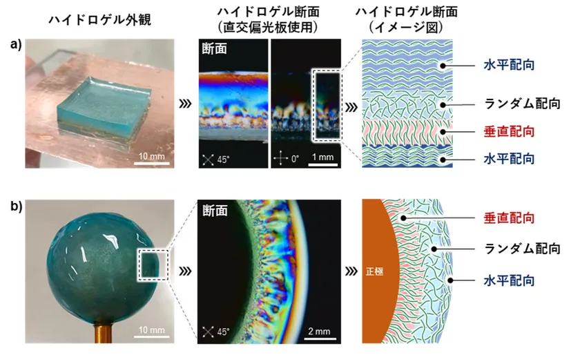 今回の研究では、「電気泳動堆積※4」と呼ばれる現象を利用して、木材由来のナノ繊維を自在に配向させ、階層構造を形成することに成功しました。水中に分散した状態では、木材由来のナノ繊維は負に帯電しています。そこに正極・負極となる2本の電極を挿し込んで電圧をかけると、負に帯電したナノ繊維が正極に引き寄せられて電極上に堆積します。この現象を詳細に追跡した結果、正極上に堆積したナノ繊維が電圧の大小に応じて水平、ランダム、垂直配向状態で固定されることを発見しました(図2)。固定されたナノ繊維はハイドロゲルを形成しており、配向状態を反映した異方的な性質を示しました。例えば、水平配向ナノ繊維ハイドロゲルは表面の摩擦抵抗がランダム配向と比べて数分の1に低下し、垂直配向CNFハイドロゲルの圧縮強度は圧縮方向に対して最大5倍程度の異方性を示しました。