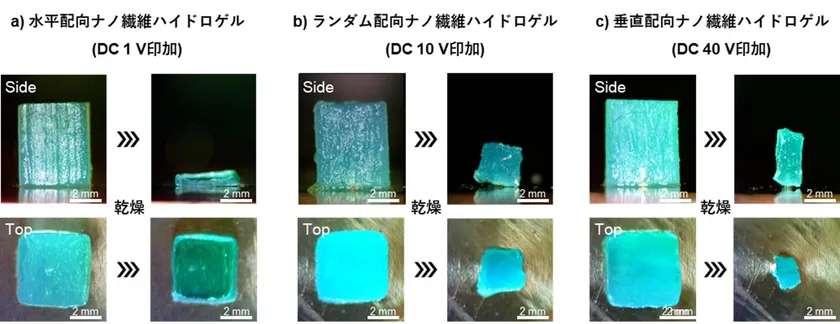 図4 配向状態で固定されたナノ繊維ハイドロゲルは、乾燥時に異方的に収縮する。例えば、a)水平配向ナノ繊維ハイドロゲルは板状に、b)ランダム配向は等方的に、c)垂直配向は棒状に収縮する。