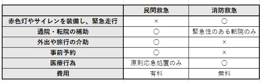 民間救急車は緊急性が低い傷病者を搬送しているため、車両に赤色灯やサイレンを装備することができず、緊急走行ができません。また利用には料金がかかり、利用前に予約をする必要があります。さらに、民間救急では応急処置以外の医行為は原則として行うことができません。しかし、家族や介助者に負担をかけずに外出が可能となる民間救急は、利用者のより豊かで自由な生活をサポートすることができます。