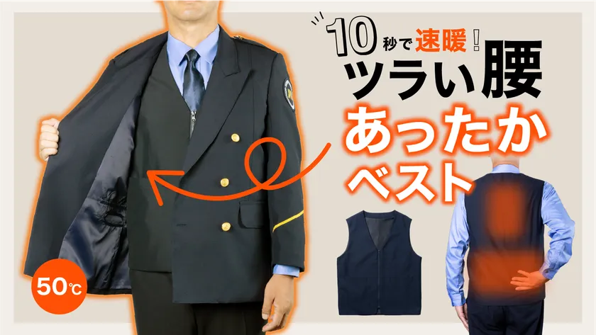 日本で会社指定のユニフォームで働く方は100万人以上。その中でこちらのプロジェクトは、警備に携わる皆さんの冬の悩みを伺い、腰の温めに特化したヒーターベストを開発しました。
