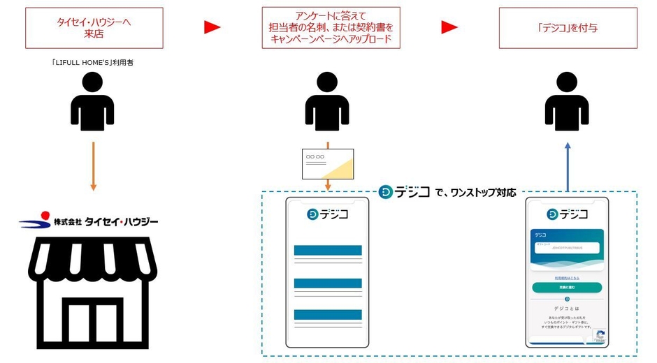 本キャンペーンには、「デジコ」が提供するOCRキャンペーンシステム(※)を活用しております。利用者は、応募に必要な素材をスマホで撮影し、キャンペーンページにアップロードしアンケートに回答するだけの簡単操作でキャンペーンに応募することができます。また、応募情報の連携や利用者へのプレゼントの受け渡しまで「デジコ」が一貫して行うため、タイセイ・ハウジーはキャンペーンの業務負荷を大きく軽減することができます。