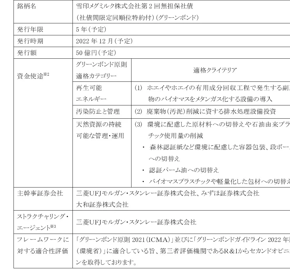 雪印メグミルク株式会社(代表取締役社長:佐藤 雅俊、以下「当社」)は、国内市場において公募形式によるグリーンボンドを発行(以下「本発行」)する予定であり、本日10月26日(水)に本発行に向けた社債の訂正発行登録書を関東財務局に提出しましたのでお知らせいたします。本発行は、当社グループにとって初めてのグリーンボンドとなります。