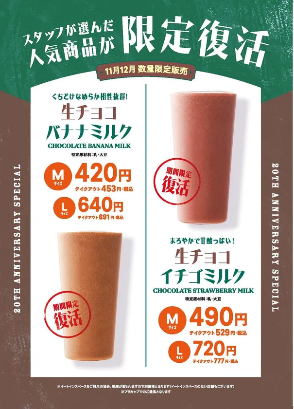 この2種のドリンクは、2019年にバレンタイン期間限定で販売した商品で、自社工場でフルーツとの相性を考えて作った生チョコを、定番の人気商品「バナナミルク」と「イチゴミルク」にミックスしたドリンクです。どちらも生チョコとフルーツの相性が抜群で、その想像以上の美味しさからスタッフ人気が高く、今回の復活販売に至りました。スタッフが自信をもっておすすめする商品です。