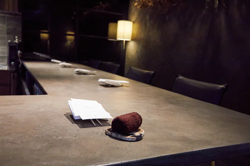 珪化木(けいかぼく)のトレーにおしぼりをのせてご提供トータルな空間演出を支えている
