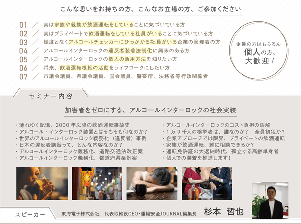 飲酒運転防止のためのアルコール検知器及びIT点呼システムを開発・販売する東海電子株式会社(本社:静岡県富士市 代表取締役:杉本 哲也)は、 この度、 「アルコール・インターロック装置本当の使い方~犯罪者を出さないための2つの方法」セミナー(無料)を11月24日(木)に開催いたします。