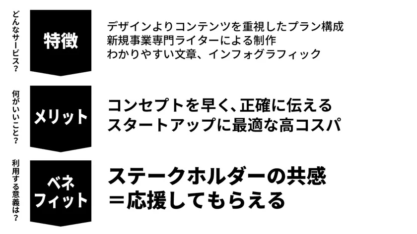 基本的なビジネスモデル、提供価値はもちろん、事業の意義を素早く「ハラオチ」してもらうことが重要。新規事業こそ、わかりやすいコンテンツにリソースを割くべきです。