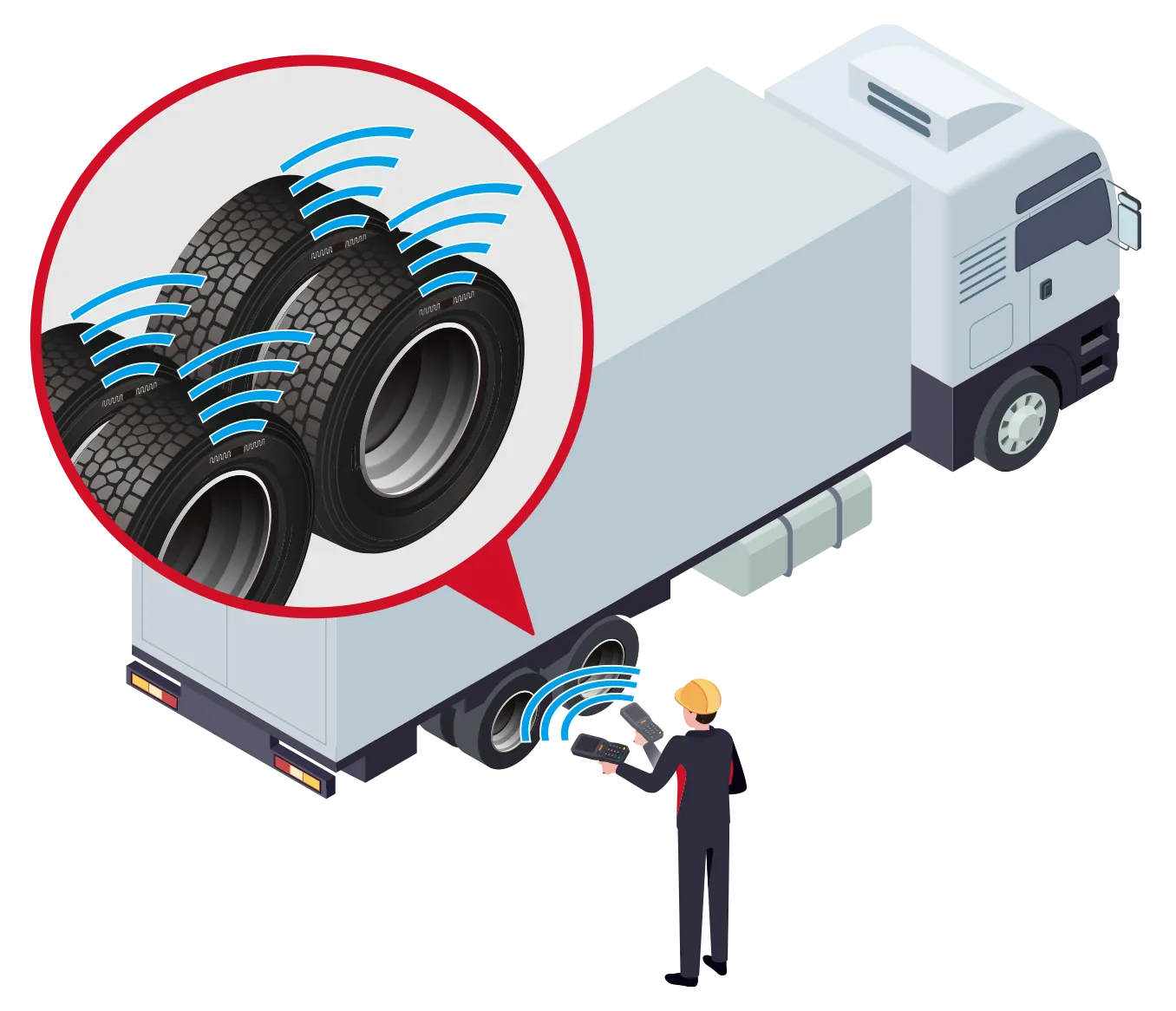 現状、輸送業者様やタイヤ販売店の現場におけるタイヤ個体管理については、タイヤ1本毎に目視で確認作業が行われています。トラック等に装着されているタイヤを確認するためには、車両下に潜り込んだり、タイヤを取り外す必要があり、現場での作業負担が大きくなることが課題となっています。