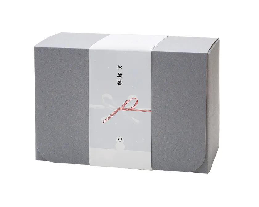 冬らしく、雪を降らせ、雪だるまをモチーフにしたデザイン帯です。お歳暮の文字、水引にも雪が積もっているのがポイントです。