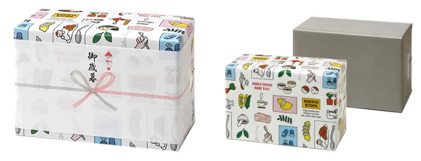 包装紙は、ニシキヤキッチンならではの素材のイラストが可愛らしいイラスト柄包装紙と、どんな用途にも使える、シックなグレー無地包装紙の2種類からお選びいただけます。