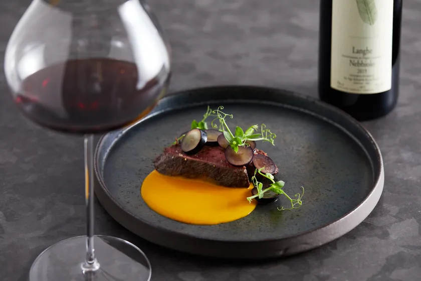 赤身質の鹿肉にネッビオーロの酸とタンニンは少し強めですが、フレッシュな葡萄と甘くこっくりとした味わいの南瓜ソースとを合わせるためのセレクトです。