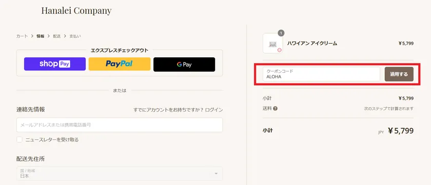 ■「ALOHA」20%オフクーポンコードの利用方法