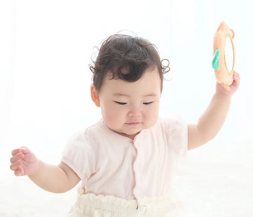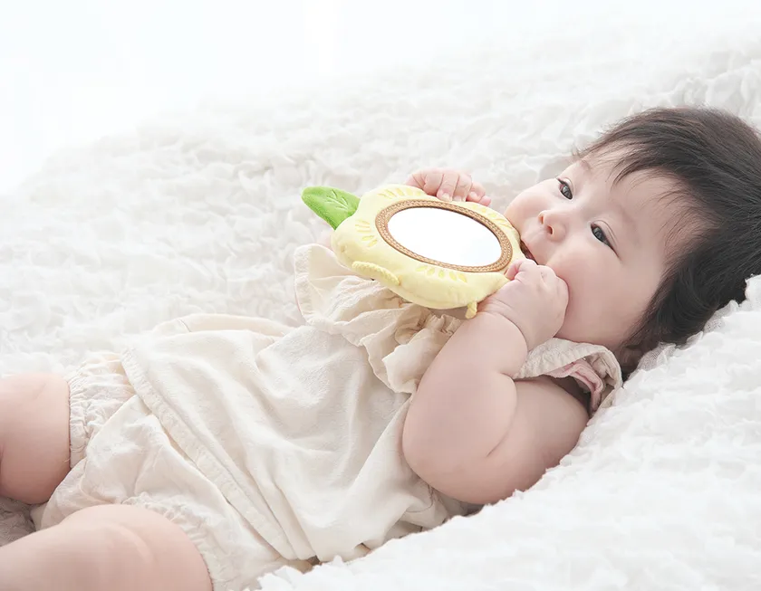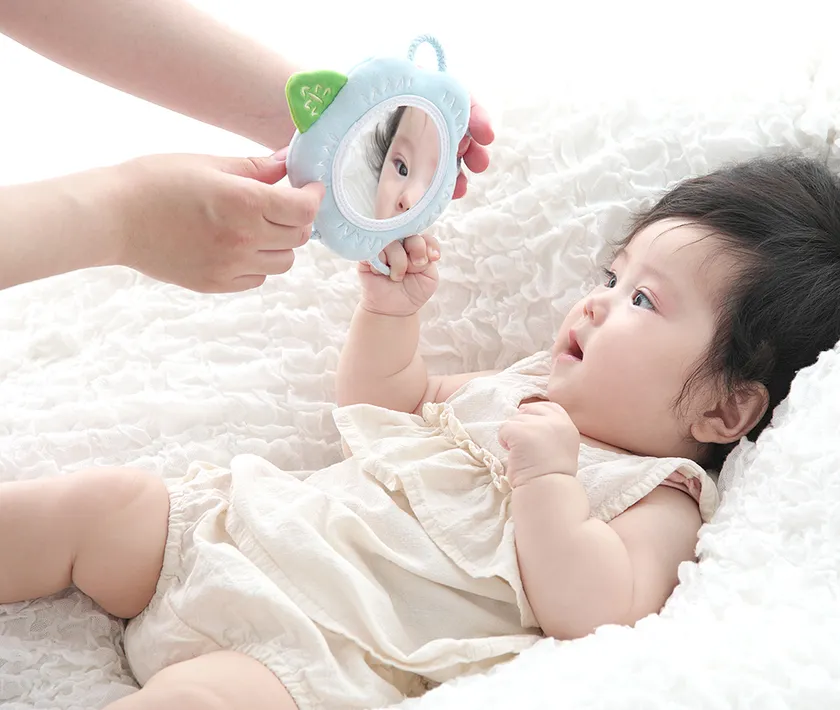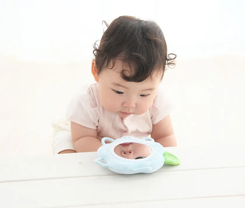 好奇心旺盛な赤ちゃんのためにつくられた布製のソフトミラーです。赤ちゃんは身の回りのものに興味が出てくる生後6か月頃から、視力の発達とともにミラーに映るものを目で追いかけたり、観察するようになります。ミラーに映るものを見ることは、赤ちゃんの想像力を育み、自己への認識のきっかけを作ります。赤ちゃんが自分で掴んでミラーを覗き込めるように、周囲には柔らかい紐のわっか(輪)を取り付けました。