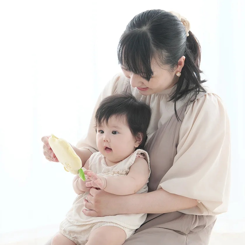 小さな子どもの手でも掴みやすい“わっか”は、指に引っ掛けて偶然持つことから始まり、発育に合わせて、意図してつかむ、振る、離す、というように動作も変化していきます。早い段階から指先の感覚を刺激することで、赤ちゃんの発達を促します。
