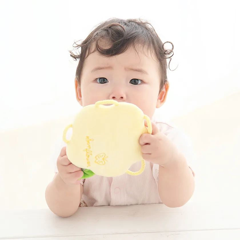 中に錆びることなく安心のプラスチック製の鈴が入っており、振るとリンリンと優しい鈴の音がします。赤ちゃんをあやす時に鈴を鳴らすことで音を認識する力を育み、親や玩具に興味を持つきっかけになります。葉っぱの部分は触るとパリパリと音がする素材が入っており、握ったり指先でつかんだりするきっかけになります。
