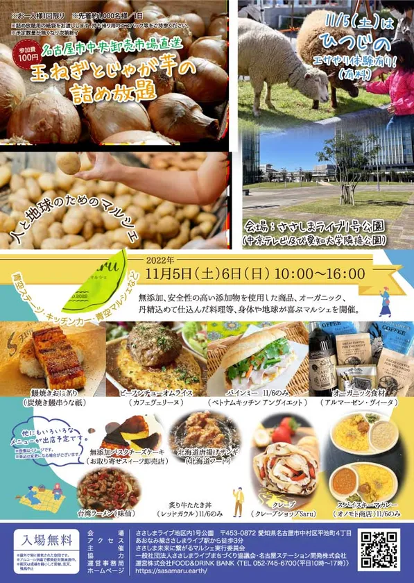 ささしま 未来に繋がるマルシェ実行委員会は2022年11月5日(土)、6日(日)にささしまライブ地区内1号公園(愛知大学及び中京テレビ隣接公園)にて「ささしま 未来に繋がるマルシェ」を開催致します。規模に関わらず地球や子供の未来を考えた商品、無添加や安全性の高い添加物のみを使用した商品を製造販売している出店者様によるマルシェです。名古屋市中央卸売市場直送の野菜の詰め放題イベントやひつじのエサやり体験(11月5日のみ)、キッチンカーの出店など多様なコンテンツをご用意しておりますので、是非ご来場ください。詳細は下記ホームページを参照ください。