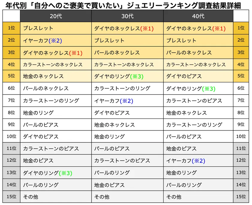 (※2) 数年前から盛り上がりを見せている「イヤーカフ」ですが、若年層のピアス離れもあるのか「ご褒美」ランキングではイヤーカフが20代が2位、30代が7位、40代が12位という結果で、若年層に人気の結果となりました。40代のランキングではイヤーカフはTOP10ランク外で、ダイヤのピアスがTOP5に入っています。