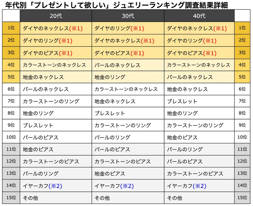 (※2) イヤーカフはどの年代も最下位の結果となりました。イヤーカフはデザインが多様なため、プレゼントとしては難易度が高そうです。