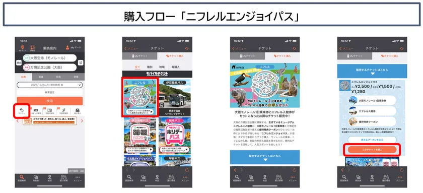 本サービスによって、キャッシュレスで「ニフレルエンジョイパス」を購入でき、チケット購入のための窓口探しや時間にとらわれることなく、スマートフォン1つで大阪モノレールが1日乗り放題となります。またニフレル入館券とセットで利用することができるため、大阪モノレール沿線の観光やショッピングなどでの移動の利便性が増します。さらに、万博記念公園周辺施設等で利用できる優待特典クーポン付きです。