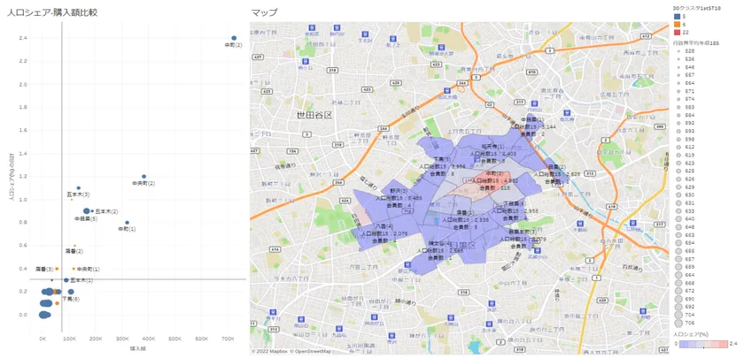 店舗の会員データを町丁目ポリゴンに取り込み、国勢調査データ(人口総数)を使ったシェア分析を実施。同時に世帯数に対する顧客シェアと購入額の関係をグラフ表示することで、会員動向の迅速な把握を実現。店舗運営の効率化と売上の拡大に向けた施策の立案をスピーディーに実施可能となります。