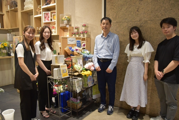 本学経営学部の山岡隆志教授(専門・マーケティング、消費者行動論)のゼミ生たちが、全国に約190店舗を展開するフラワービジネス最大手「株式会社日比谷花壇」と連携して企画した新商品5アイテムが7月4日から17日まで、名古屋市中村区名駅の日比谷花壇KITTE名古屋店で試験販売されています。6日には山岡教授と学生が店頭を訪れ、顧客の行動を店員に聞き、買い物客の観察などをしました。