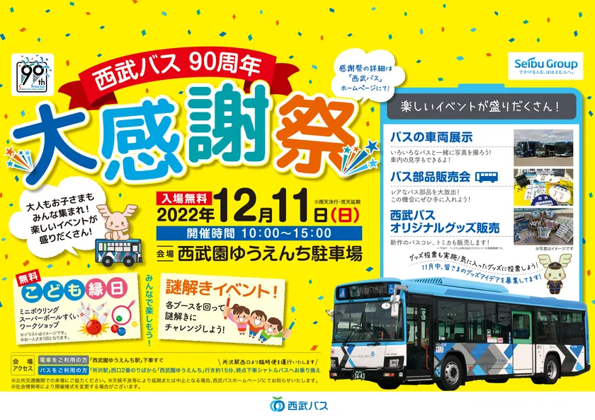 西武バス株式会社(本社:埼玉県所沢市、代表取締役社長:塚田 正敏、以下「西武バス」)は2022年に設立90周年を迎えました。これに際しまして、今日までご利用いただいたお客さまへの感謝の想いと、当社バスへより一層の親しみと期待を感じていただきたいという気持ちを込めまして12月11日(日)西武園ゆうえんち駐車場にて、『西武バス90周年 大感謝祭』を開催いたします。
