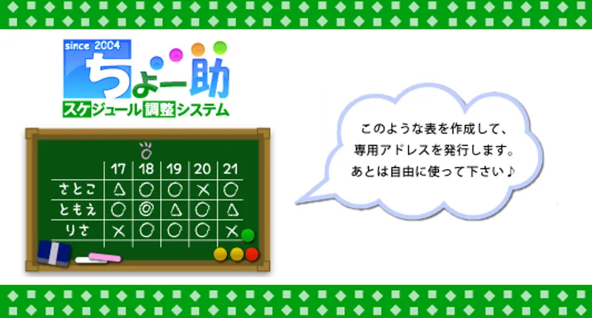 「ちょー助」は2004年(前身の「スケジュール調整太郎」は2001年)に開始した、今では一般的になった日程調整支援Webサイトの草分けです。同種のサイトが、人名を模したネーミングになっているものが多いのは、パイオニアである「ちょー助」の影響と言えます。