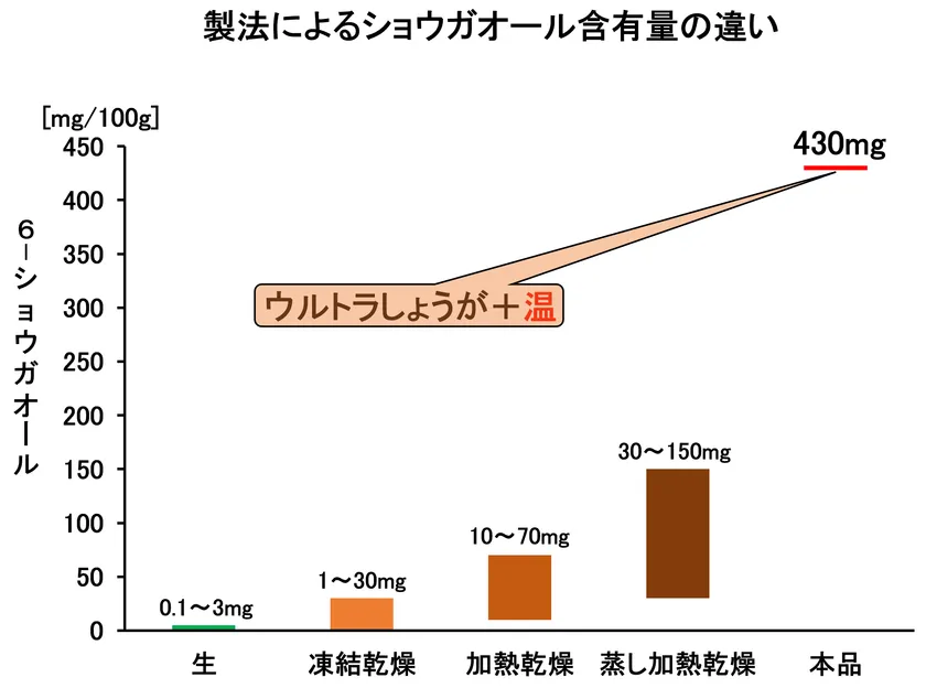 ショウガオールの含有量は、しょうがの種類・産地・保存期間などによって異なりますが、グラフに示すように、大体、100g中に生のしょうがで0.1~3mg、凍結乾燥(フリーズドライ)しょうがで1~30mg、加熱乾燥しょうがで10~70mg、蒸し加熱乾燥しょうがで30~150mgですが、本品は430mg(4,300ppm)です。