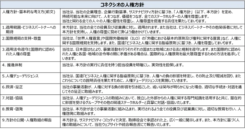コネクシオ株式会社(本社:東京都港区、代表取締役社長:直田 宏、以下 当社)は、この度、「人権方針」を新設し、「ダイバーシティ&インクルージョン推進の基本的な考え方」を改定しました。