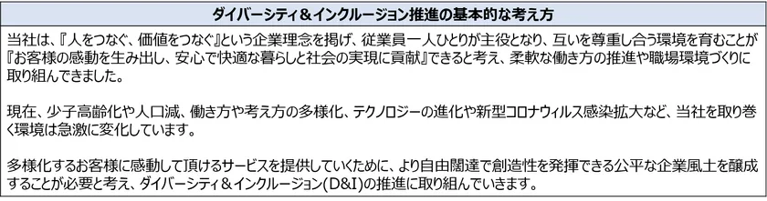 今後、当社は事業活動において、「人権方針」ならびに「ダイバーシティ&インクルージョン推進の基本的な考え方」に則り、これまで以上にダイバーシティ&インクルージョンの推進を強化し、人をつなぎ、価値をつなぎ、事業を通じた社会課題の解決に取り組んでまいります。