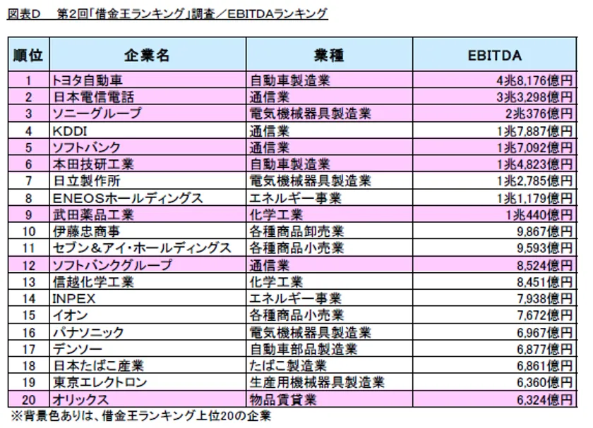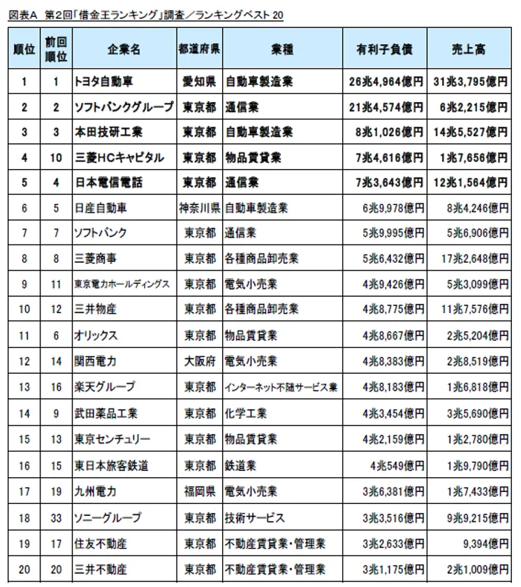 上位20社の業種としては、自動車製造業、物品賃貸業、通信業、電気小売業が3社ずつランクインしています。特に、自動車製造業と通信業においては上位7社までに3社ずつランクインしており、有利子負債の多さが目立つ結果となりました。