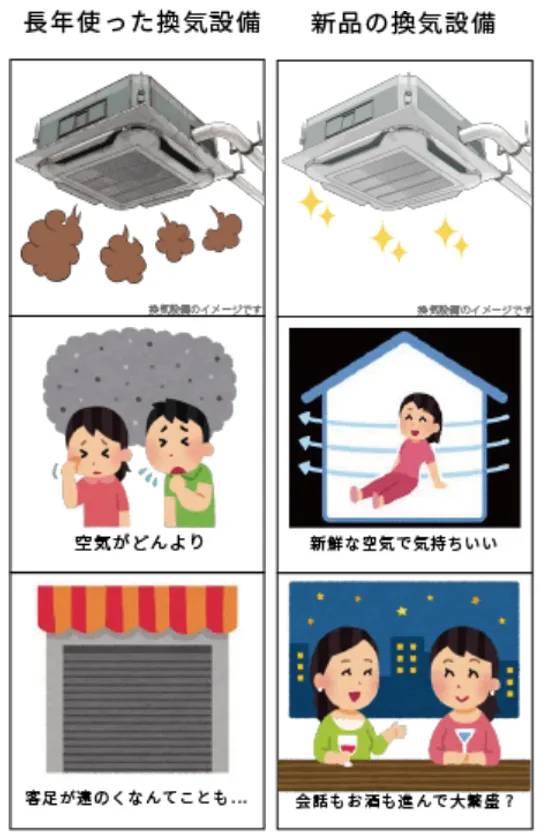 トイレと換気設備を助成金でリニューアルすることで、ご来店いただくお客様にも心地よくお過ごしいただけるため、滞在時間が延びることで自ずと単価が上がり、売上アップに繋がる可能性もあります。(※業務用のビルトインエアコンのみならず、ルームエアコンでもご利用可能な場合がございます。)