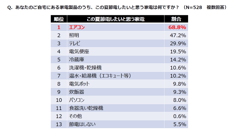 この夏、節電したい家電1位はエアコン 、9割以上の人が省エネ・節電のために工夫をしたいと回答
