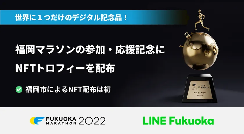 LINE株式会社(本社:東京都新宿区、代表取締役社長:出澤 剛)、福岡を拠点とする子会社のLINE Fukuoka株式会社(本社:福岡県福岡市博多区、代表取締役社長 CEO:鈴木 優輔、以下 LINE Fukuoka)は、11月13日に実施される福岡マラソン2022にOFFICIAL COMMUNICATION PARTNERとして参画しています。LINE Fukuokaは、テクノロジーとコミュニケーションの力で大会を盛り上げるべく、福岡マラソン実行委員会と連携して実施する企画の第三弾として、大会当日の11月13日から11月16日までの期間中、ランナー、応援者、ボランティアや市民の皆さまにむけた「福岡マラソン2022」の記念品として、NFT(非代替性トークン)のバーチャルトロフィーを配布することをお知らせいたします。