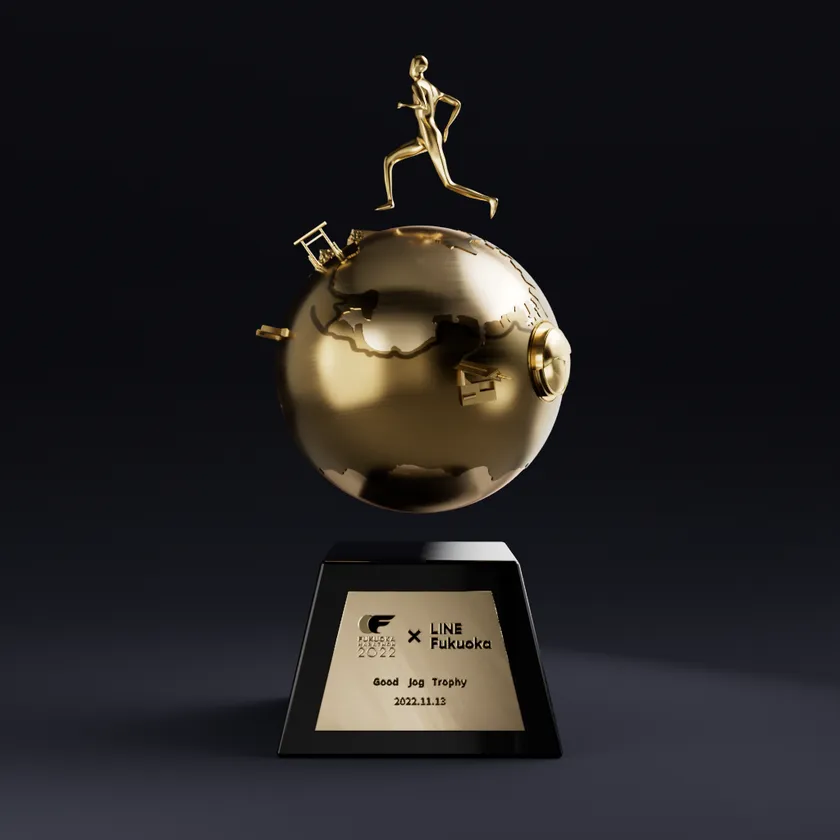 「福岡マラソン2022」のバーチャルトロフィーは、3Dデータで制作されたリアルな質感と動きのあるデジタルアイテムです。福岡PayPayドーム、福岡タワー、二見ヶ浦など、42.195キロのコース上にあるスポットを立体的に配置し、見るたびに「福岡マラソン2022」を思い出していただけるようデザインしました。