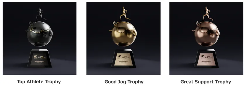 すべてのランナーに届ける「Good Jog Trophy」、大会を支える応援とサポートに感謝する「Great Support Trophy」、上位入賞者を称える「Top Athlete Trophy」の3種類があります。ひとつひとつのトロフィーはNFTによって受け取った人に紐付き、持ち主であることを証明ができるようになります。さらに、受け取ったNFTはLINEのプロフィールアイコンに設定してお楽しみいただけます。なお、本NFTはLINE独自のブロックチェーンである「LINE Blockchain」を採用しております。