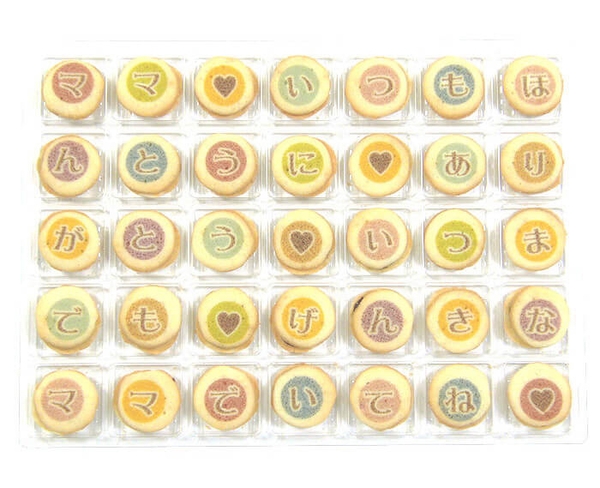 35粒のクッキーにメッセージをのせて、感謝の気持ちを贈りましょう。人気の「クッキーメール」は、おうさまのおやつで特別な母の日バージョンがお求めいただけます。