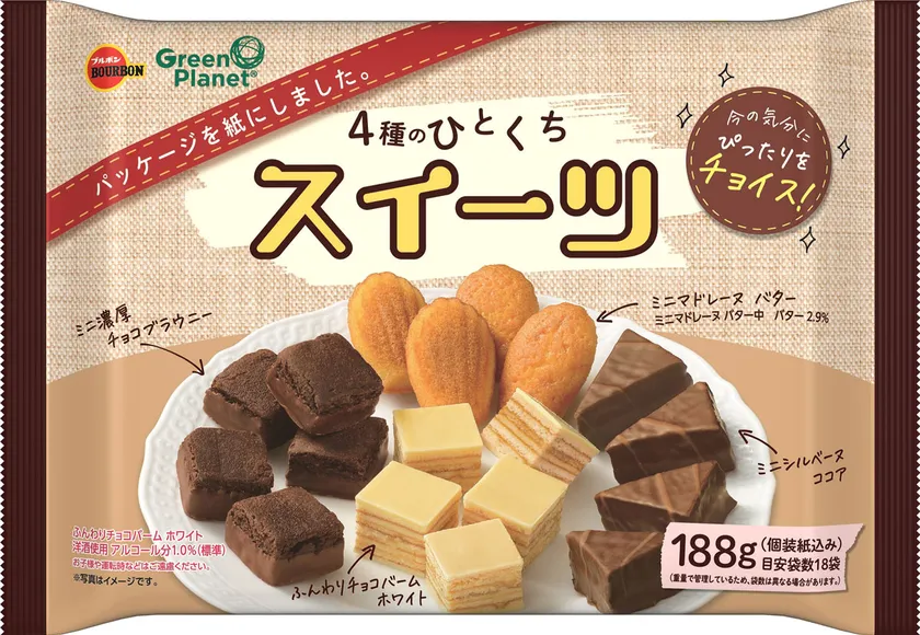 ブルボン、外装に“紙パッケージ”を採用! 「4種のひとくちスイーツ」を11月15日(火)に新発売 ~ 紙の比率を大きく高めた外装パッケージ ~