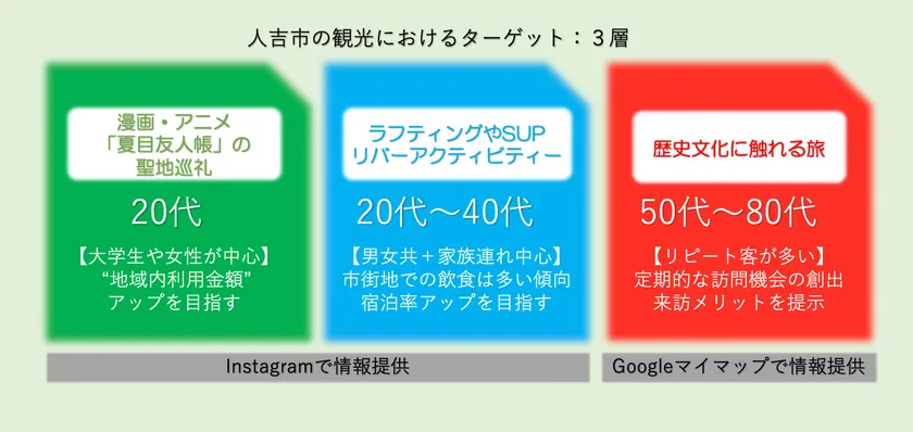 豊かな資源を持つ人吉市への観光客は、大きく3つのカテゴリーに分けられます。漫画やアニメで人気の「夏目友人帳」の聖地巡礼を目的とした女性を中心とした若者層、人吉市の豊かな自然を活かしたラフティングやSUPなどのリバーアクティビティを目的とする20代から40代、歴史文化に触れる旅を目的とする50代から80代のリピート客です。