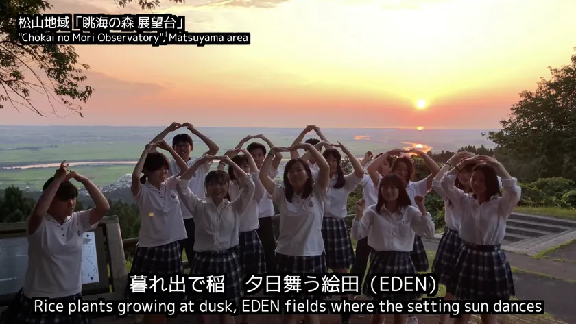 酒田南高等学校と松山観光バス株式会社(山形県酒田市)が企画・制作し、酒田南高等学校・観光地域創生専攻の2、3年生の生徒が作詞・歌・ダンスで出演した、酒田観光PR&バス安全啓発ソング「夕日舞う絵田(EDEN)~2222年へつなぐハピハピデリシャス!~」のMusic Videoが完成。2022年10月31日に酒田南高等学校YouTubeチャンネルで動画を公開しました。