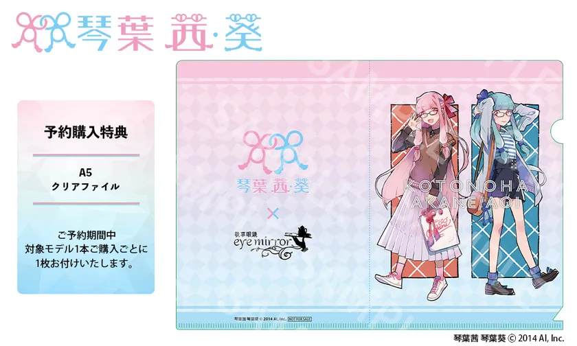 予約期間中に、「琴葉姉妹」コラボレーション眼鏡を1本ご購入毎に、描き下ろしイラストを使用したA5クリアファイルを1枚お付けします