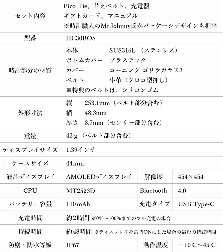 ビジネスシーンにおいて腕時計は、薄く・アナログ・シンプルなデザインが良いと一般的に言われています。しかし、現在多く見られるスマートウォッチは厚みがあり、カジュアルな印象のデザインが主流です。Pico Tieはデジタル大国台湾の大手液晶メーカーが薄さにこだわりぬき、6.8mmの薄さでスーツがキマる、軽量で疲れにくいビジネスマンに向けたスマートウォッチを開発いたしました。