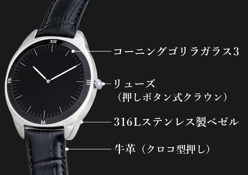 ベゼルにハイグレードなステンレス素材のSUS316L、カバーには高い透明度と強度を誇るコーニング ゴリラ ガラス 3を採用。文字盤は1.39インチの大きめサイズで操作がしやすく、クロコ型押しの牛革を使ったベルトやリューズの存在も、アナログ時計のような味わいを引き出しています。