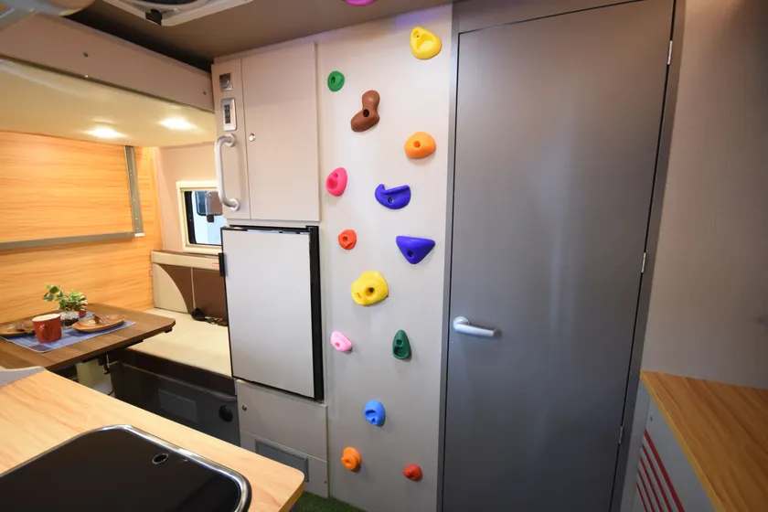 またシェルでは、通常のキャンピングカー(同社「SAKURA」比)の2倍以上のデパーチャーアングル(※1)を確保し、悪路で前後左右が不揃いに隆起している険しい山道でも車体のねじれ範囲が大きいので路面の追従性が良く安定した走行が維持できることや、内装床部分の多くに防水パンを敷き詰め、エントランスからマルチルームにあるトイレまで外履きのままで通れるようにするなど、災害時使用も想定したワイルドな仕様に仕上げています。
