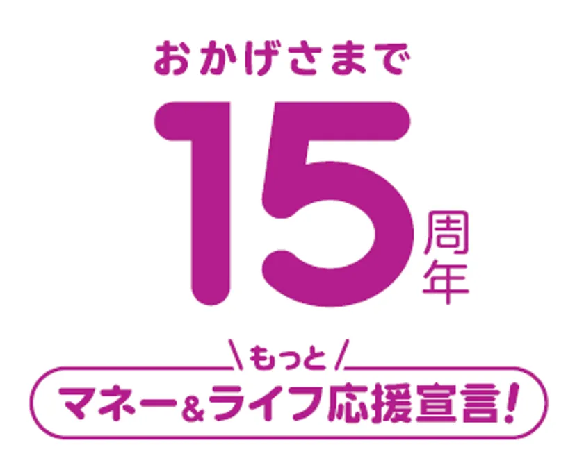 これまでご愛顧いただいたお客さまへ「感謝」の気持ちを込め、また、新たにイオン銀行をご利用いただく方のご期待にお応えできるよう、「もっと マネー&ライフ応援宣言!」をキャッチコピーに掲げ、11月1日(火)より15周年を記念した様々な企画を実施いたします。