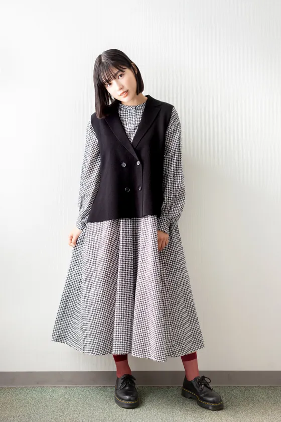 千鳥柄を大胆に使ったワンピースはフレアに広がるシルエットとふんわりボリュームのある袖がポイント。上品な印象ですが、ベストやニットと合わせて様々なスタイリングに合わせることができます。落ち感のあるコットン100%を使用しているのでシーズンレスで着ることができます。
